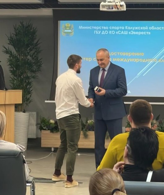 Во время торжественной встречи министр спорта Калужской области Олег Эдуардович Сердюков вручил нашему спортсмену Денису Лобанову удостоверение и значок мастера спорта международного класса.